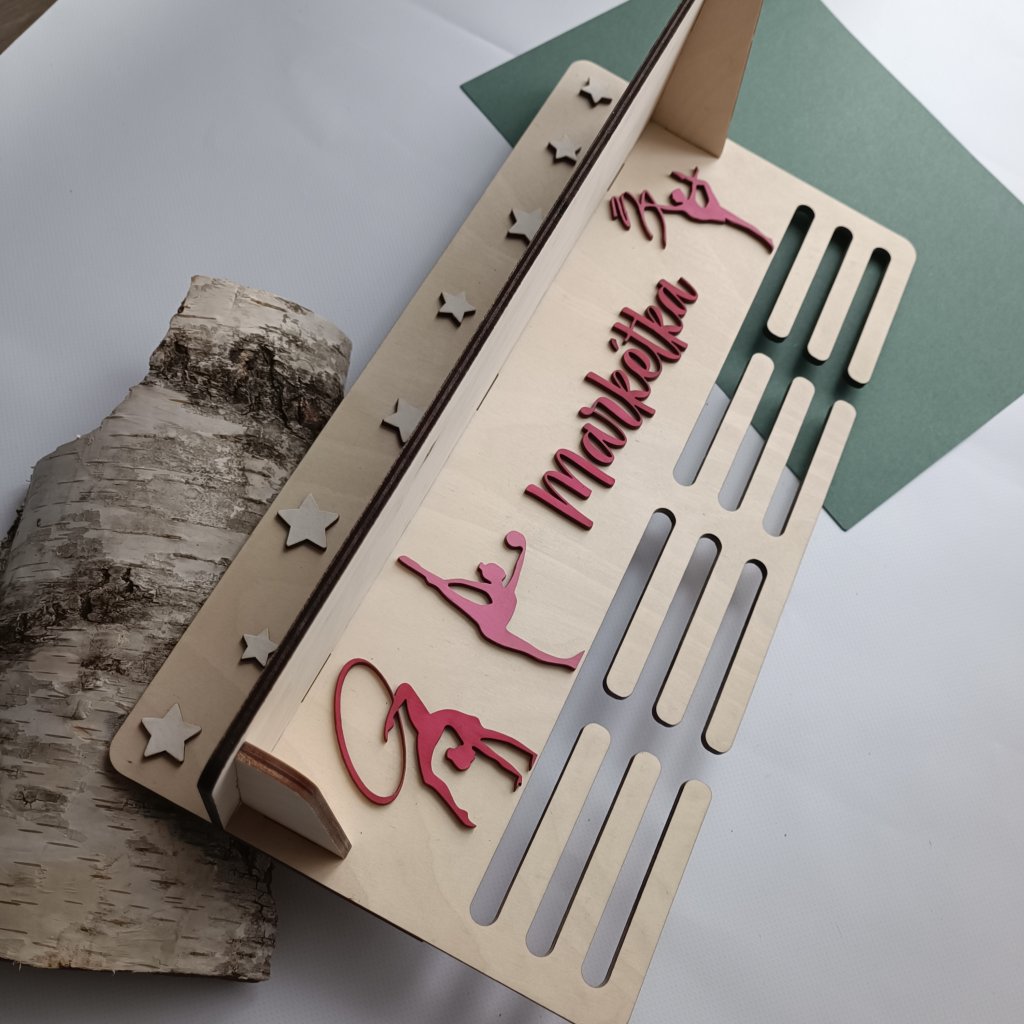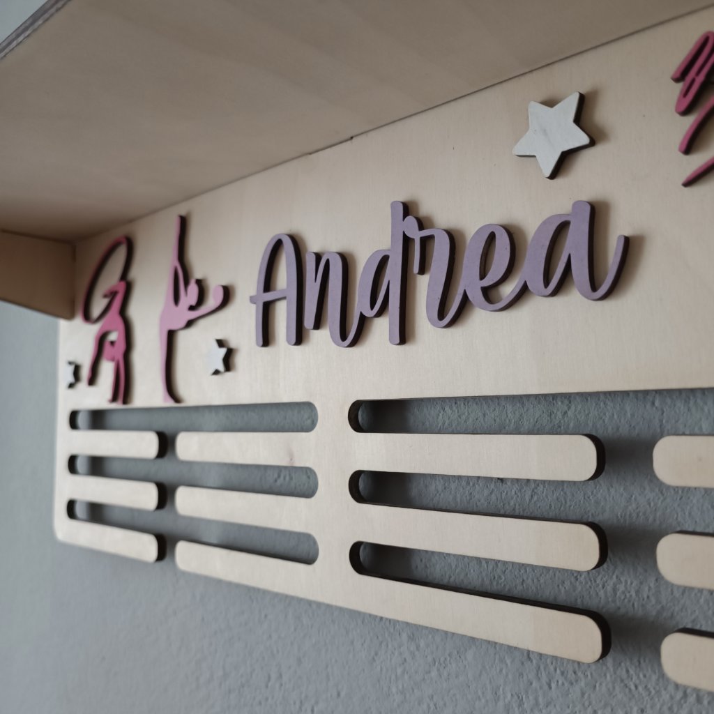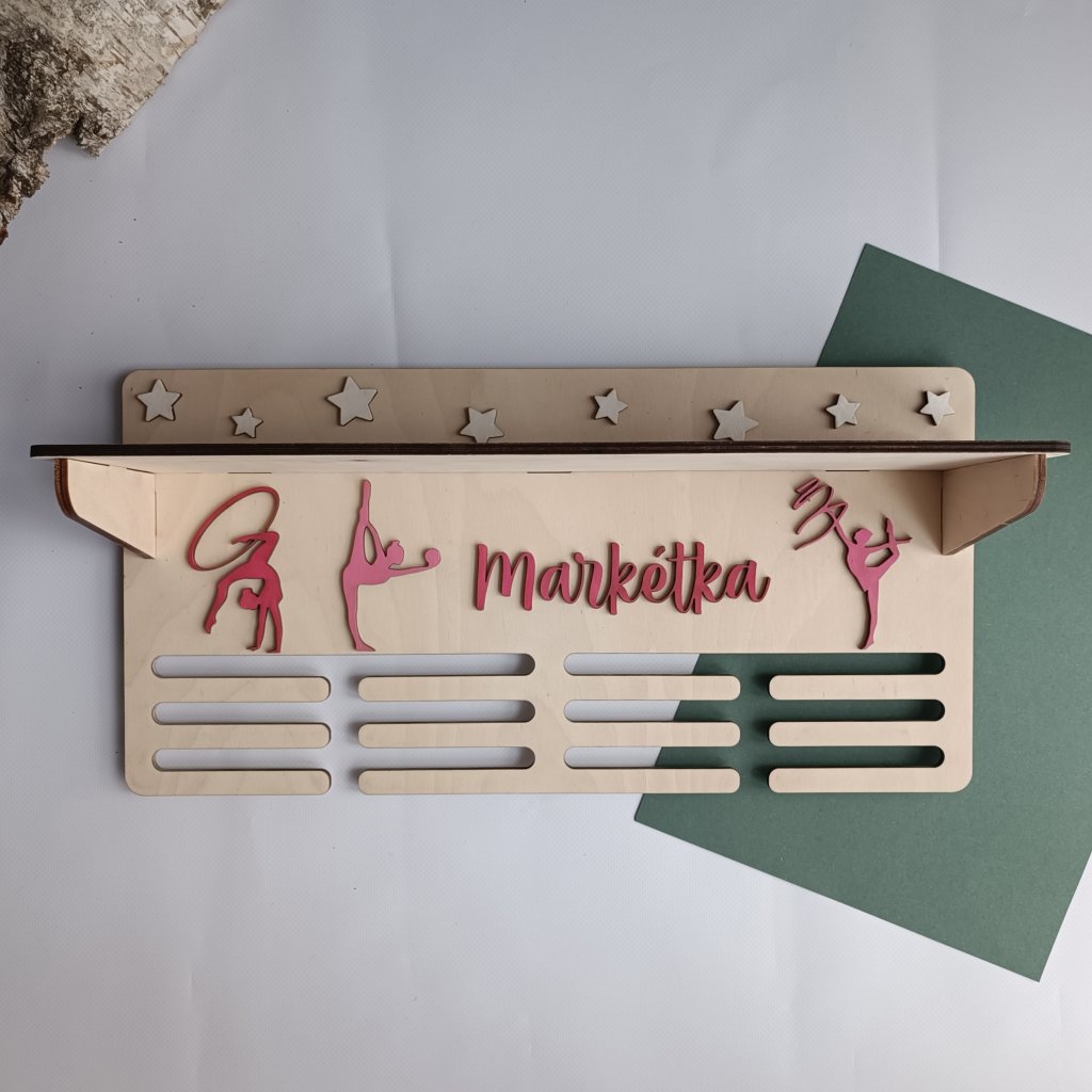 Uspořádejte své sportovní úspěchy stylově a přehledně. Tento jedinečný držák nabízí prostor pro vaše medaile s personalizovaným motivem a jménem, a navíc praktickou poličku, kde můžete vystavit i trofeje či další ocenění. Perfektní kombinace krásy a funkčnosti, která podtrhne hodnotu vašich vítězství a dodá vašemu pokoji osobní a inspirativní nádech.